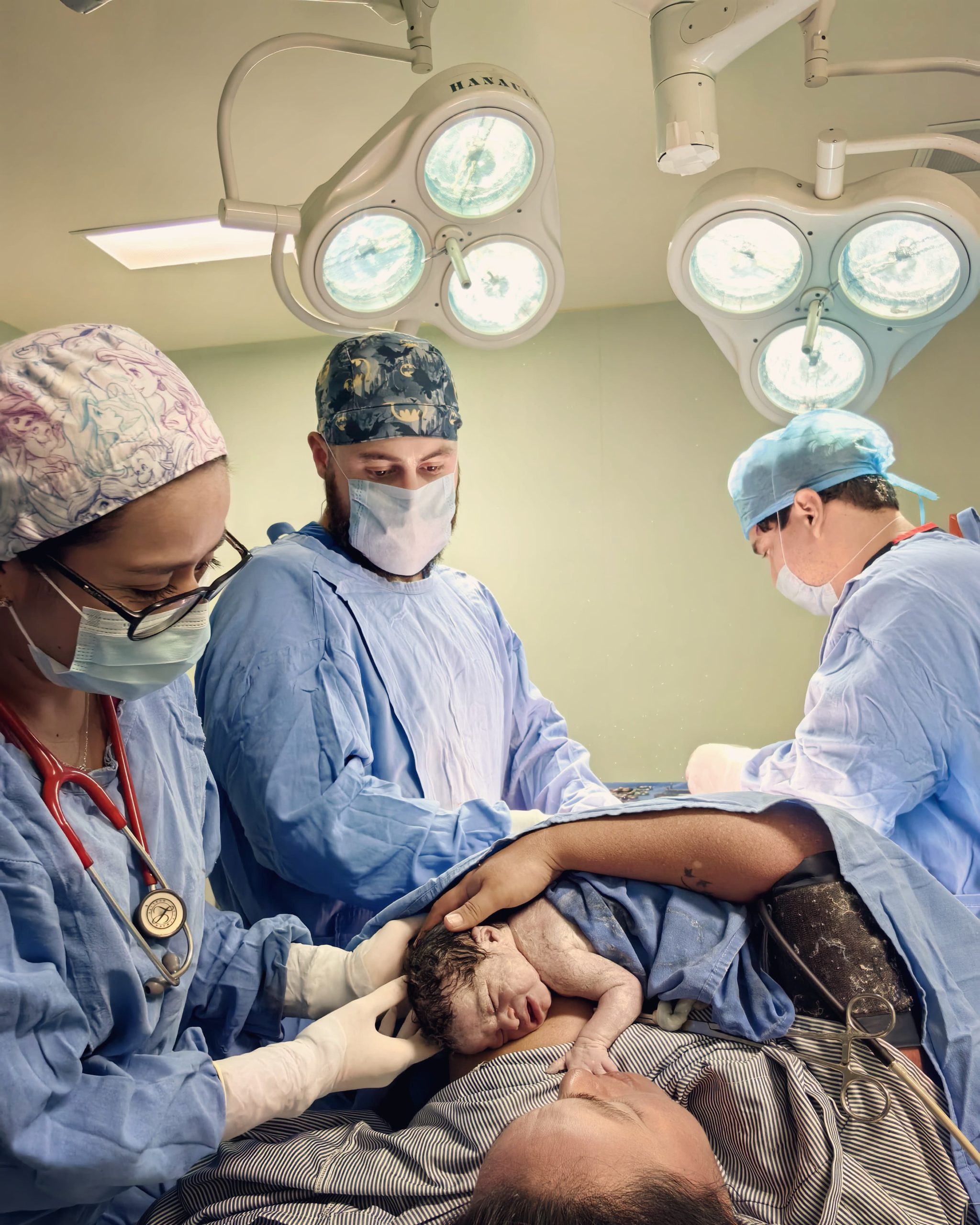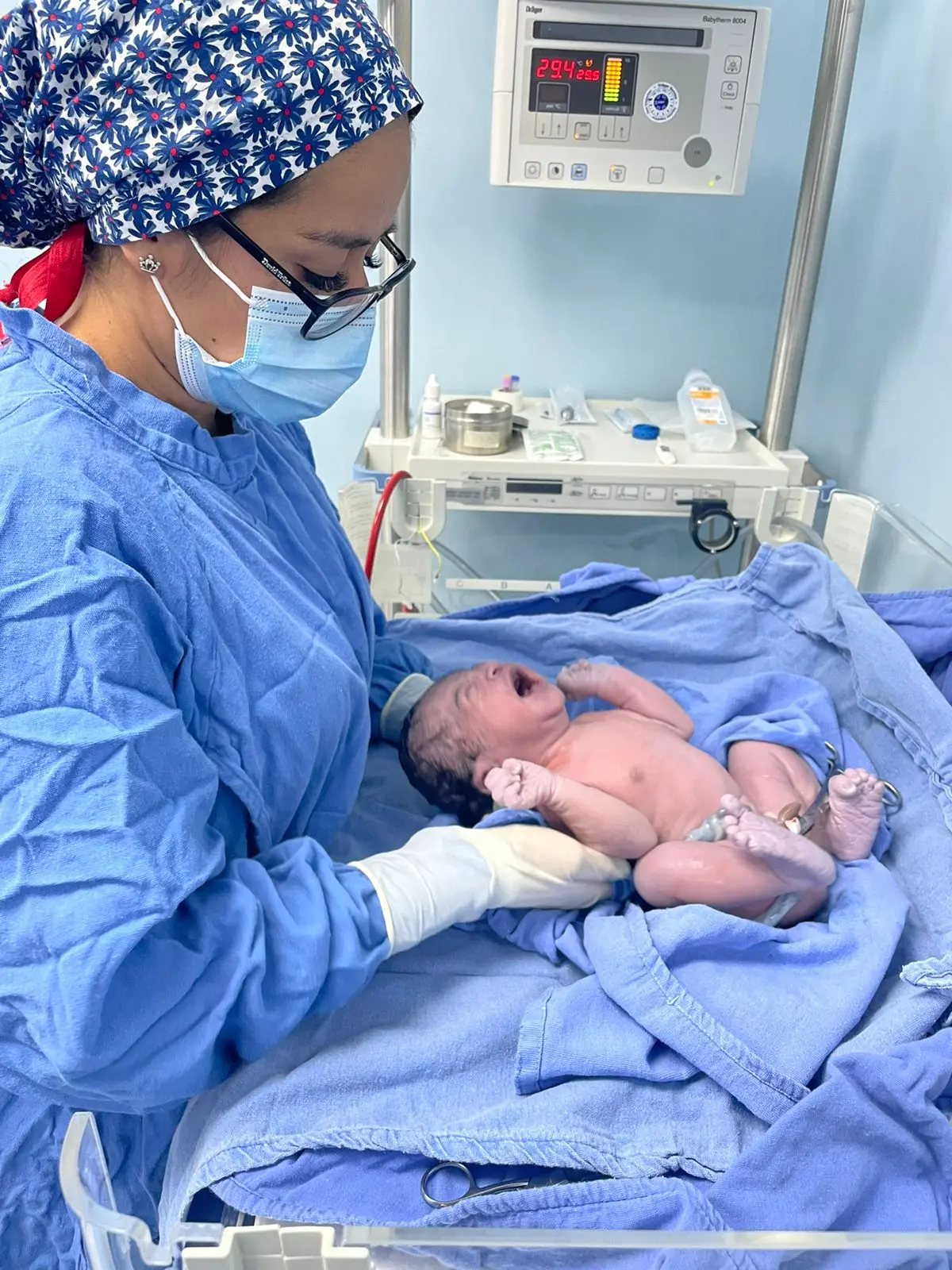 Cuando el estado clínico del recién nacido lo permite, la Dra. Blanca Vélez promueve el contacto piel con piel entre madre e hijo desde los primeros minutos de vida, incluso durante la intervención quirúrgica.